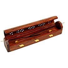 Valentine's Day thank giving Gift, Wooden Coffin Incense Stick Cone Burner Holder Stand with Storage Compartment Ash Catcher Hand Carved with Elephant Brass Inlay
