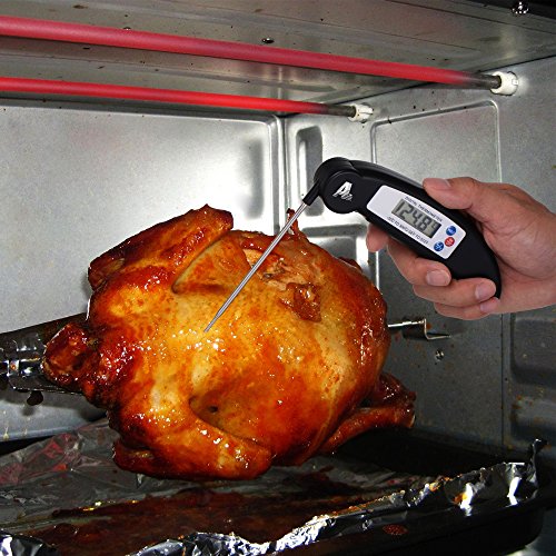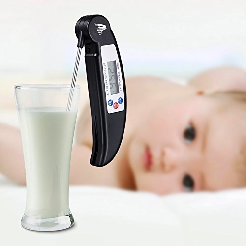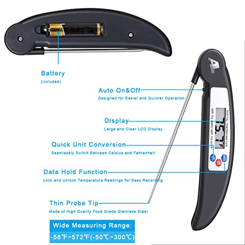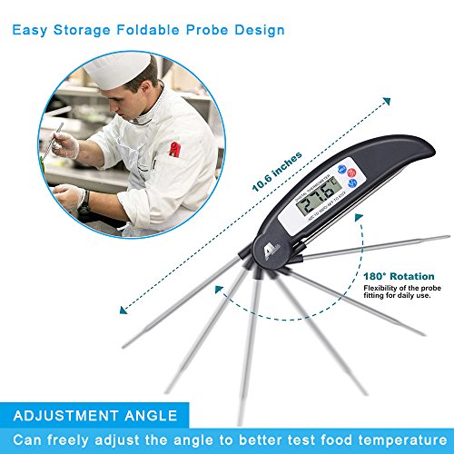 - 【EASY TO USE AND STORE】Kitchen Thermometer with foldable probe design folds away easily and locks into base for portability and storage.Pocket-sized thermometer features an impact-resistant, antimicrobial thermoplastic shell to prevent warping, cracking, and bacterial growth.