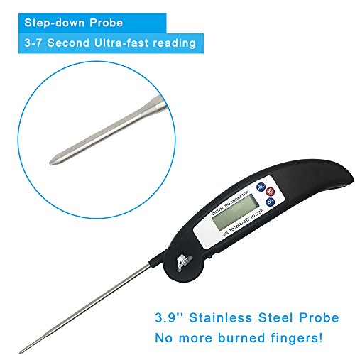 - 【SUPER FAST AND ACCURATE】Instant Reading Thermometer gets temp readout within 3-7 seconds with high precision sensor.Meat Thermometer with 3.8" food grade stainless steel probe with Step-down Tip design to display temp faster