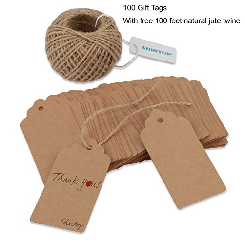 Shintop 100PCS Kraft Paper Gift Tags Bonbonniere Favor Rectangular Gift Tags with Free 100 Feet Natural Jute Twine (Oblong Paper Tag)