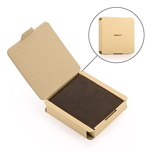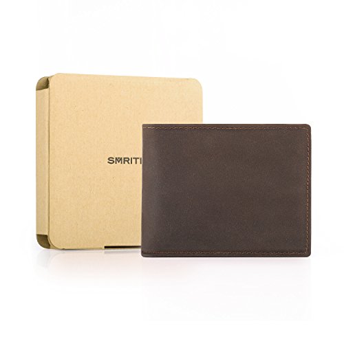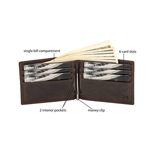 -. Binding : Apparel -. Brand : Smriti -. Color : Brown -. Department : mens -. EAN : 0600978762049 -. Feature : Crazy-horse genuine cowhide leather with soft polyester lining, the wallet is built to last for years / One bill compartment and a removable metal money clip store your money securely and handily / 6 quick-access card slots and 2 interior slip pockets keep up to 8 cards at easy access / Our bifold wallet (4.3 x 3.4 x 0.5″) suits for US bills with compact size and fits into your any front or back pocket of jeans easily / Unique leather grain makes its own style for each wallet, while colored in brown curates a subtle retro effect -. ProductGroup : Apparel -. ProductTypeName : ACCESSORY -. Size : Bi-fold -. Title : Smriti Slim Leather Bifold Wallet Front Pocket Wallet with Money Clip - Brown -. UPC : 600978762049
