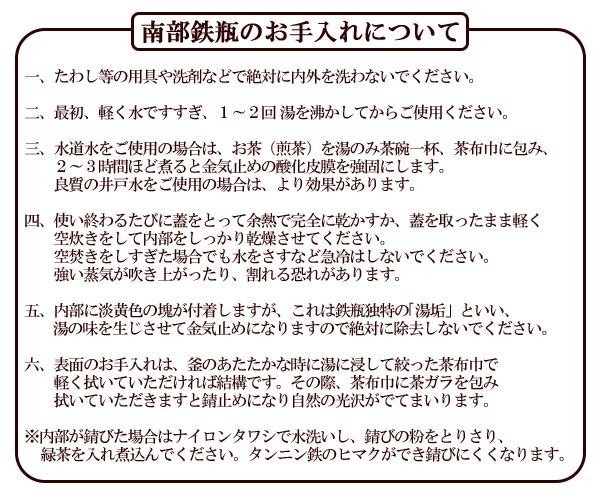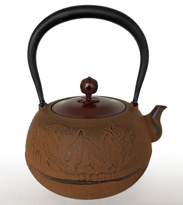自由に飛行する神通力を備えるといわれ、吉祥とされる竜文様を施した南部鉄瓶です。内部は約900度の木炭炉で焼くことで四三酸化鉄の酸化被膜(焼皮)を生じさせる金気止めを施し、表面は「漆」「茶汁」を焼き付ける昔ながらの伝統技法で丁寧に仕上げております。銅蓋が古風な鉄瓶に加え高級感を演出します。沸かしたお湯には体に吸収されやすい鉄分が溶出します。 |