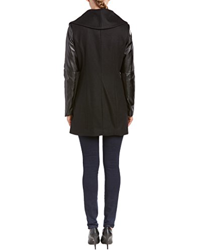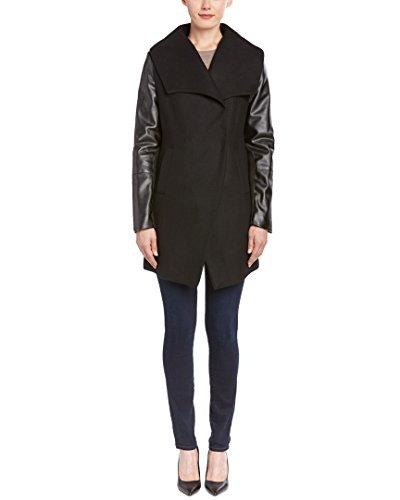 Product DescriptionAsymmetrical wool coat with snap closure. Vegan leather sleeves with power stretch0