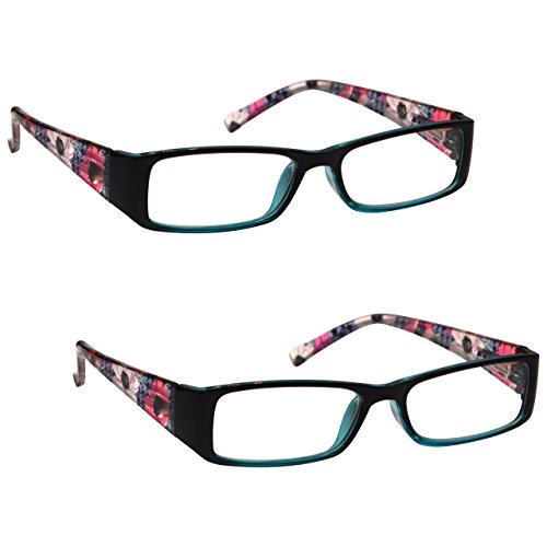 Zwei Paare von leicht frauen / damen lesebrille zu einem fantastischen Preis! Für den Innenbereich / normale Lesebedingungen. Stabile Rahmenkonstruktion mit gefederte Scharniere. Schwarz-Grün mit Blumenmuster Seiten. Inklusive FREE Schutzhülle. Optische Leistung +2,50 (Dioptrie).