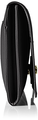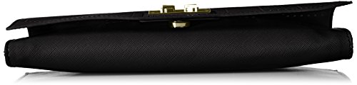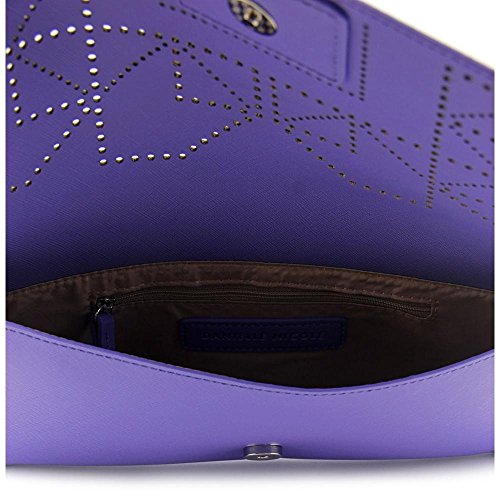 -. Feature : Slender clutch with laser cutout design and gold-tone hardware