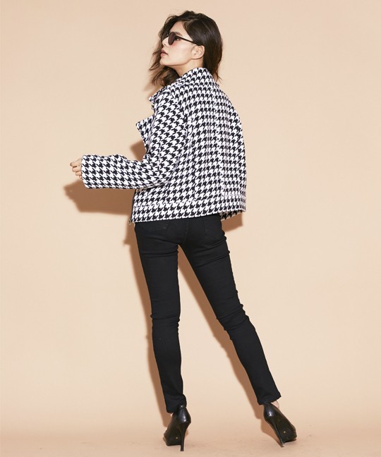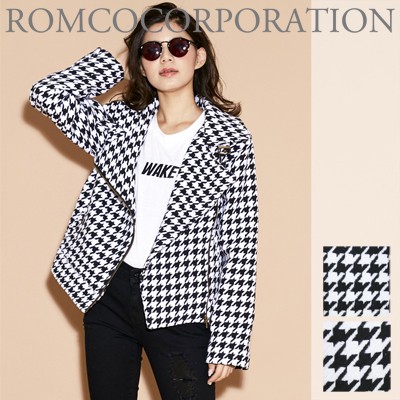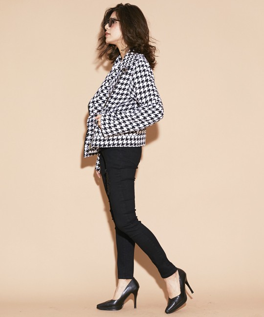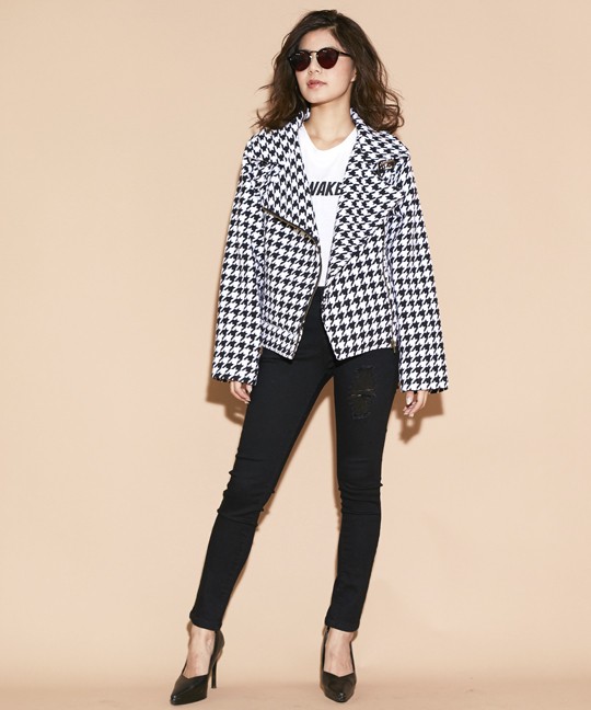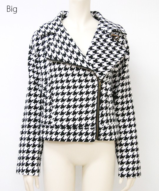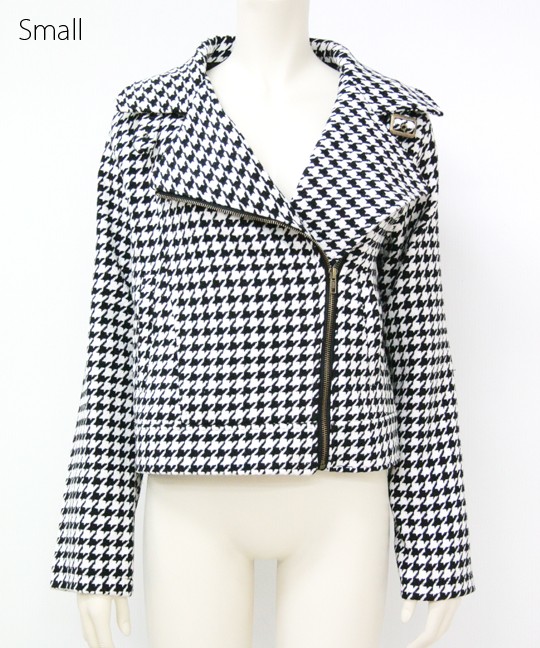 秋冬らしい素材に千鳥柄を使用した個性派ライダースジャケットです。大きめの衿が可愛く存在感のあるアイテムになっています。しっかりした厚い素材で作られているので、美しいシルエットを保ったまま着ていただけます。下はスキニーパンツを合わせるのがおすすめです。Mサイズ