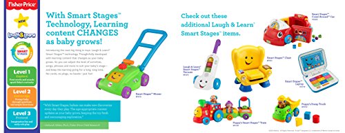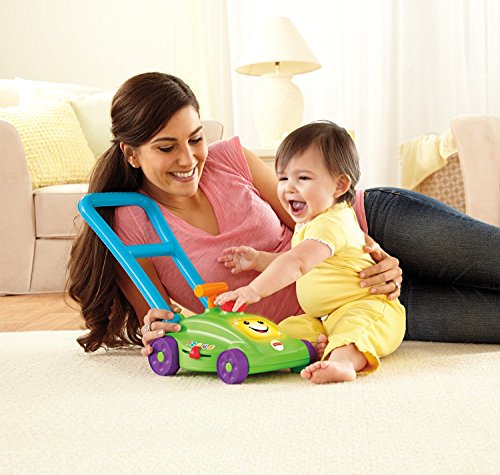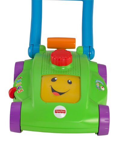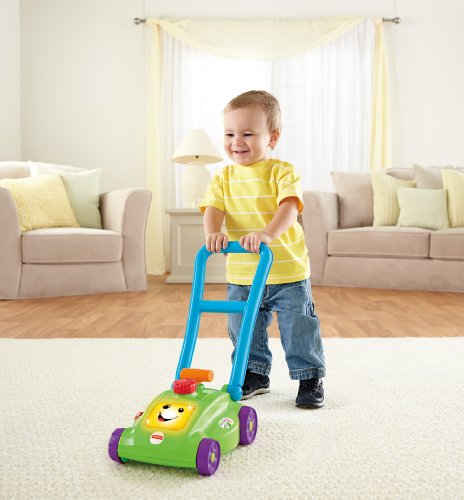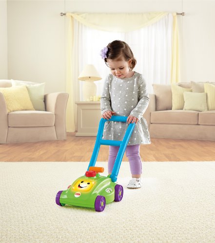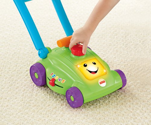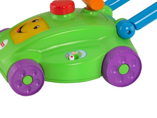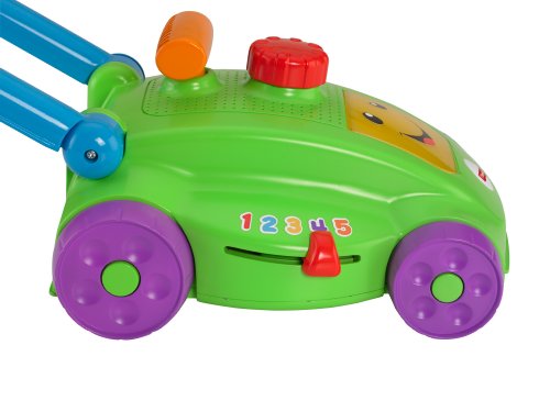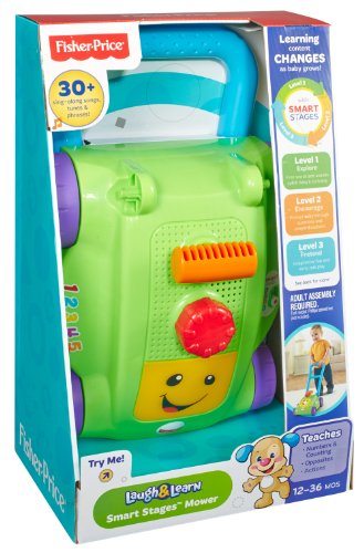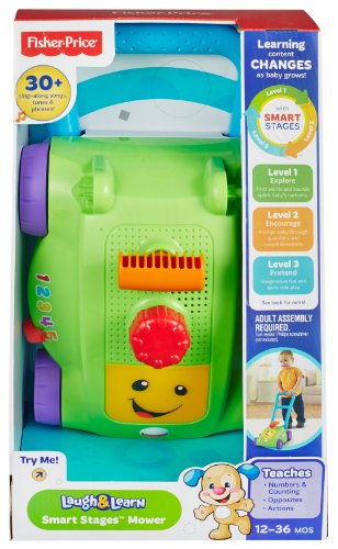 It's time to mow the lawn - with a fun push toy that inspires early role play. Push the mower along to hear songs and phrases that introduce numbers, opposites, actions and more. Baby can turn the gas cap, pull the lever or slide the switch for more songs and phrases. And, the mower's face lights up and dances along to the music! The mower includes Smart Stages technology, an exciting new way to change the learning content as baby grows. No fussy cords, plugs or hassle. Every baby develops at their own pace and Smart Stages technology gives you the ability to select the stage that's best for your child! There are a variety of developmentally appropriate songs, phrases and sounds within three levels of play. Smart Stages Technology Level 1 - Explore - 6M+ First words and sounds spark baby's curiosity Level 2 - Encourage - 12M+ Prompt baby though questions and simple directions Level 3 - Pretend - 18M+ Imaginative fun and early role playFeature