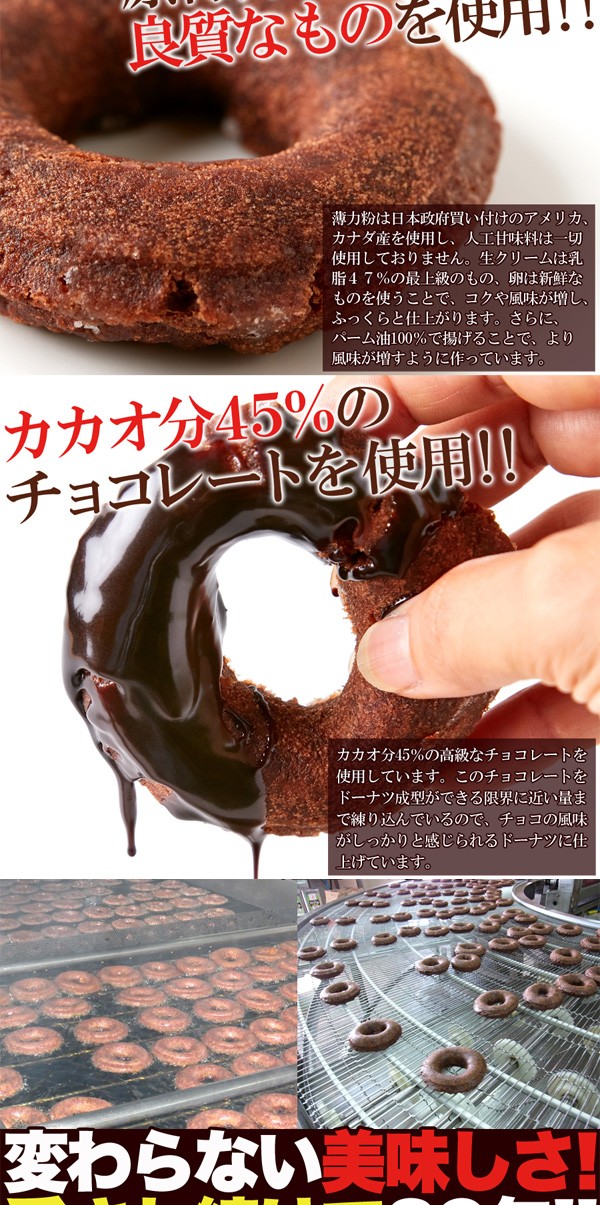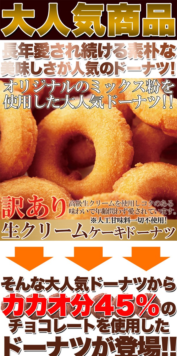 原材料名 小麦粉、糖類(砂糖、ブドウ糖)、植物油脂、鶏卵、ココア、生クリーム、脱脂粉乳、食塩、ベーキングパウダー、乳化剤、香料、着色料(ビタミンB2)(原材料の一部に大豆を含む)