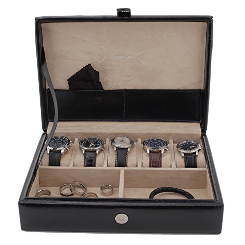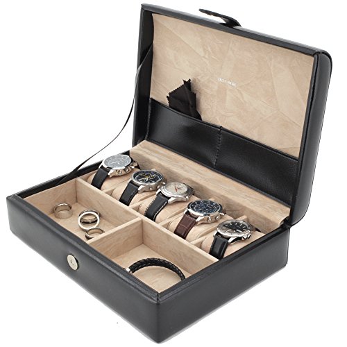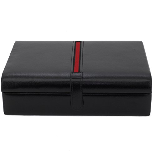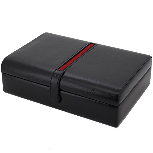 Studio : Tech Swiss Publisher : Tech Swiss Binding : Watch Product Description Timeless style, impeccable quality is the best way to describe this classic valet for watches, jewelry, and eyeglasses case. Tech Swiss handcrafted black calf Italian leather with stripe down the center is functional valet. The unique case comes with 5 watch cushions, and 4 spacious compartments which allows for storage of glasses, rings, bracelets, necklaces, cuff-links and more. The interior is lined with a plush beige faux suede, and is equipped with a magnetic lock. Complements any desk, dresser, and any home decor. Perfect gift! Dimension L 11 1/2" x W 8" x H 3 1/2" Includes Complementary Microfiber Polishing Cloth 0