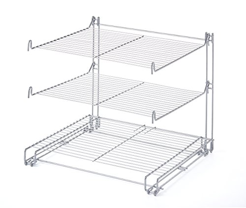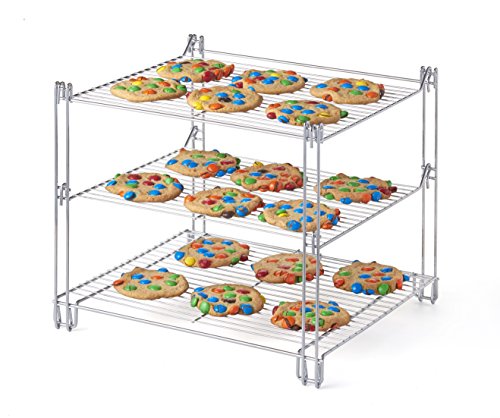 Studio : Kovot Publisher : Kovot Product Description Running out of counter space when doing a cookie batch? The KOVOT 3-Tier Collapsible Cooling Rack has a space saving design that goes vertical, freeing up precious counter space while cooling large amounts of baked goods. Made of durable nickel-chrome plated steel, this patented design folds flat for easy storage. An extra support arm folds up from underneath the 3-tier cooling rack so you can cool your heavier cakes and pies. The all steel rack is non-stick coated and is dishwasher safe. 3 levels of cooling space, while only taking up a square foot. Measures: 13 1/2" x 12" x 11 1/2" 0