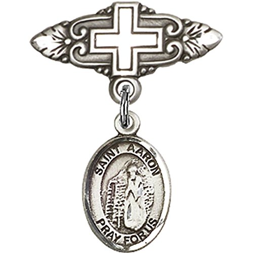 -. Title : Sterling Silver Baby Badge with St. Aaron Charm and Badge Pin with Cross 1 X 3/4 inches
