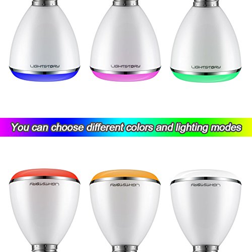 Color changing speaker bulb: Multicolor dimmable LED light bulb; 4 color models of light and more than 12 bright shades for your preference; it displays the latest color of light you used last time