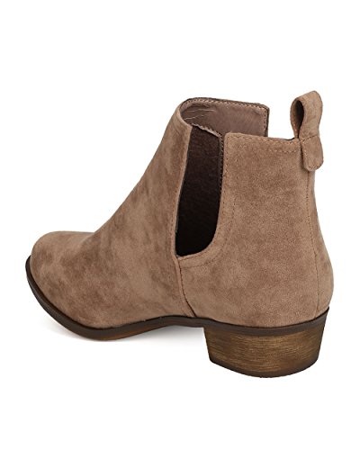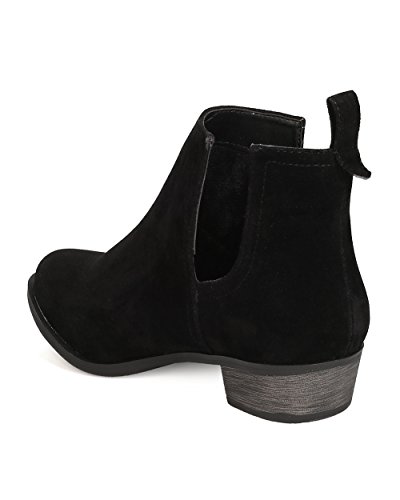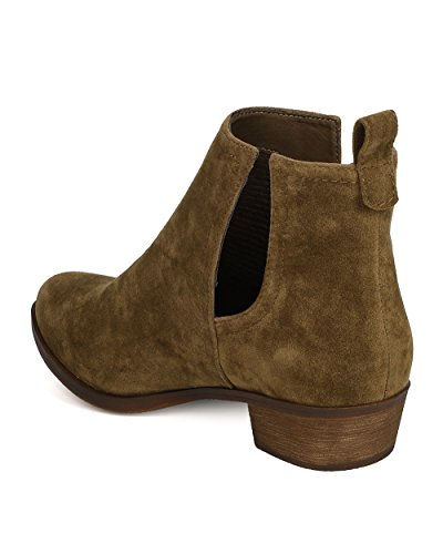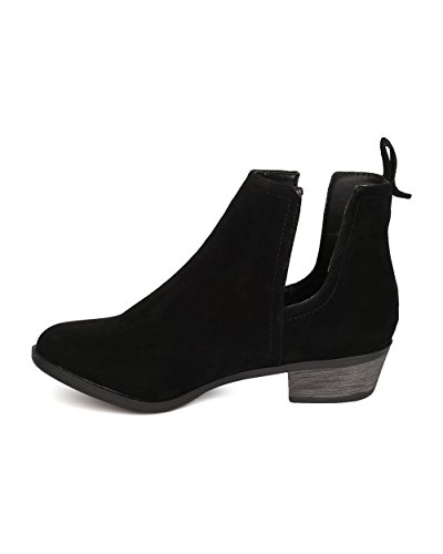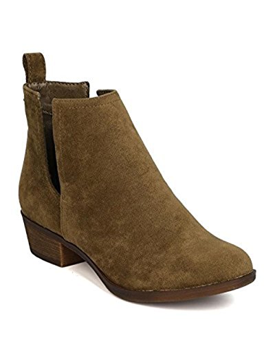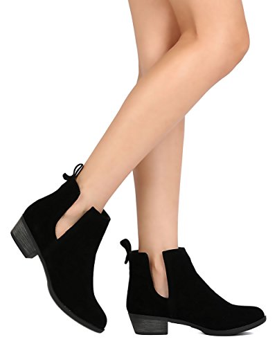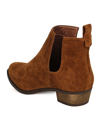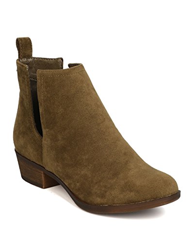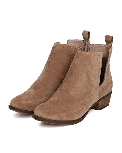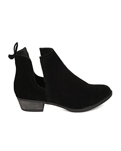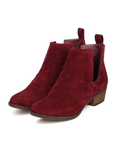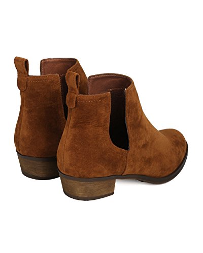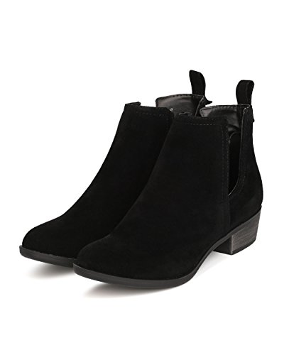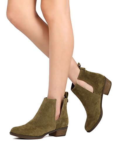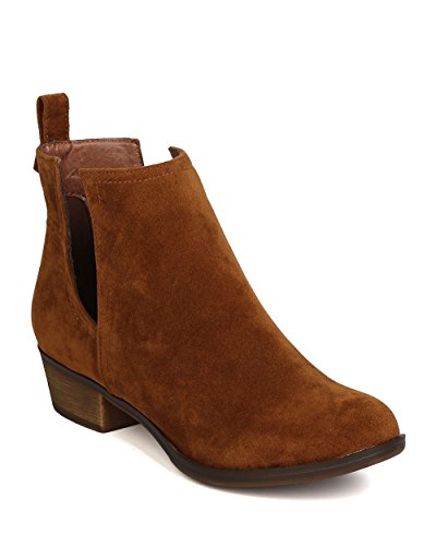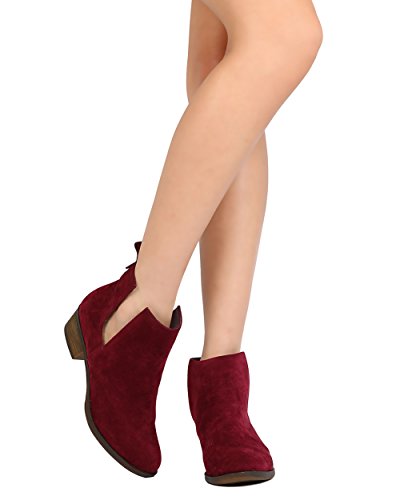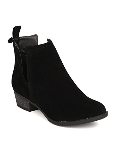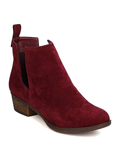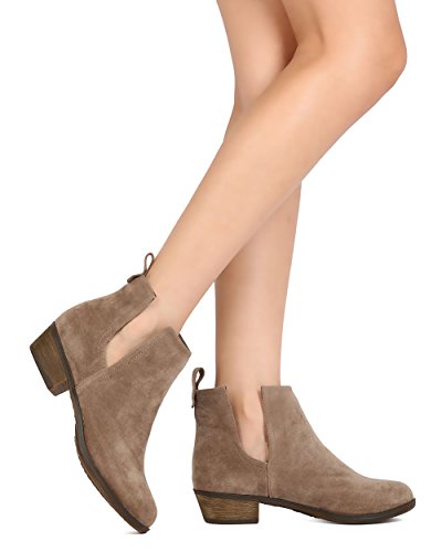 Product Description These faux suede booties are made with an almond toe, stitch accents, and cut out side panels. Also made with a faux wooden, low chunky heel, and easy to pull up design. 0