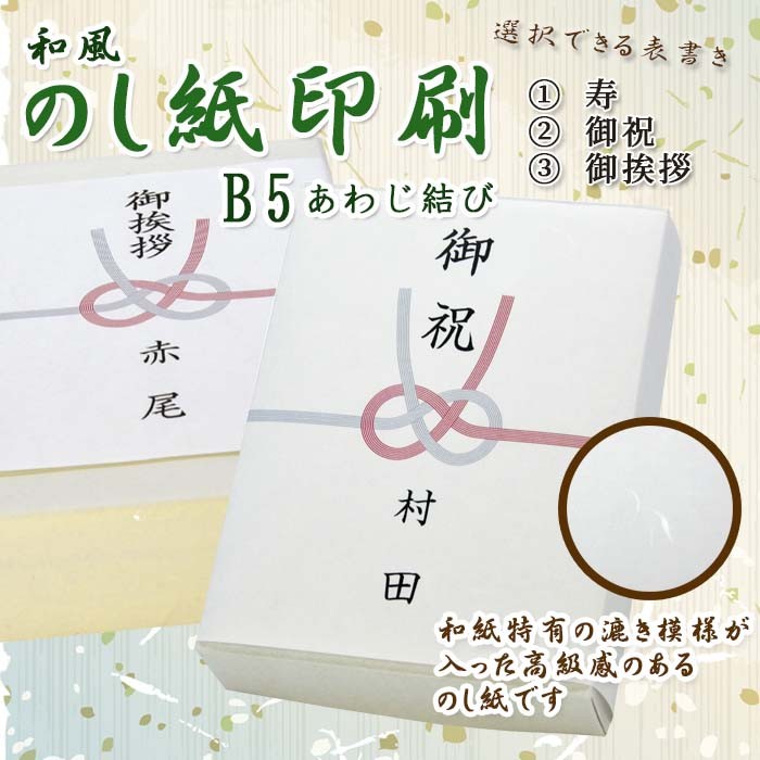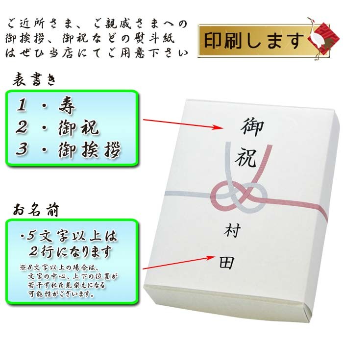 | 表書きを選んで、あなたのお名前を印刷・・・・・・ 末永いお付き合いをという意味があるあわじ結びの熨斗を、独特の漉き模様が入った和紙に印刷しました。 和紙に印刷することで、品の良いのし紙に仕上がっております。 御結婚の御祝や御挨拶、関西ではその他様々な御祝に使えるあわじ結び。 表書き、お名前印刷ができる当店で、ぜひご購入下さい! 【ゆうメール 送料無料】 <表書き> 1:寿 2:御祝 3:御挨拶 <水引> あわじ結び(7本) <サイズ> 縦182mm×横257mm <入数> 20枚入り <素材> 和紙 |