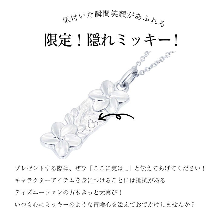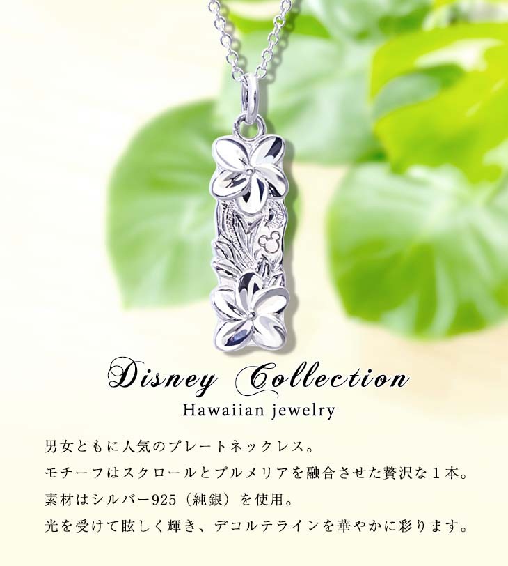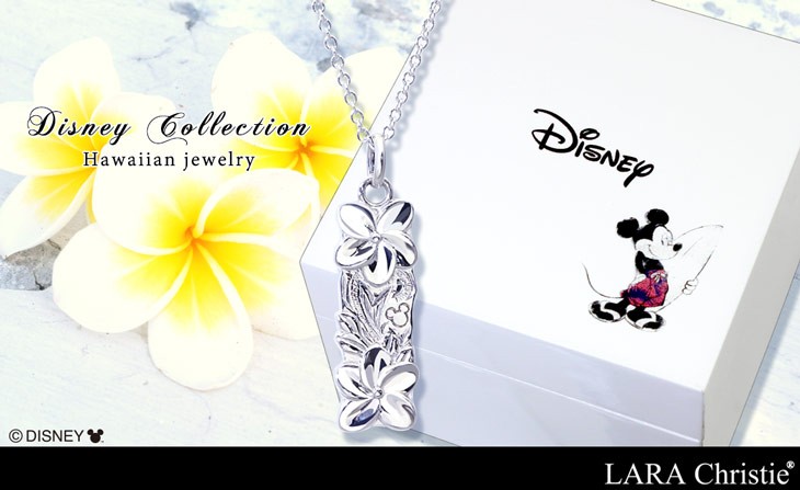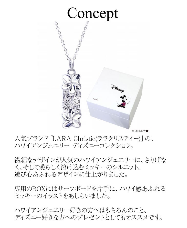人気ブランド「LARA Christie(ララクリスティー)」の、ハワイアンジュエリー ディズニーコレクション。専用のBOXにはサーフボードを片手に、ハワイ感あふれるミッキーのイラストをあしらいました。ハワイアンジュエリー好きの方へはもちろんのこと、ディズニー好きな方へのプレゼントとしてもオススメです。男女共に人気のプレートネックレスに、「身につける人の魅力を引き立てる花」と呼ばれるプルメリアと「途切れることの無い永遠」を意味するスクロールを贅沢にデザインしたネックレス。立体的なデザインで、細部までお楽しみいただけます。ユニセックスなデザインがペアジュエリーとしてもオススメ!チェーンは人気のアズキチェーン40cmにアジャスター5cmの付いた贅沢仕様!コーディネートにより長さを変えることができます。大切な人への誕生日・記念日・お祝いなど贈り物としてもぴったりです。サイズ:縦 約 25mm/横 約 6mmチェーン:40cm(+アジャスター5cm)素材 :シルバー925付属:ブランド純正ボックス/ショッパー(C)DISNEYLicensee:NAKAGAWA CORPORATION