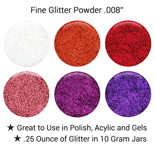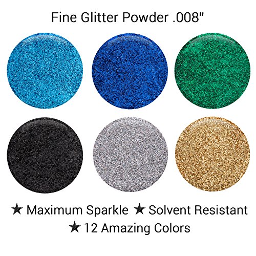 All 12 fine glitter powders are solvent resistant and can be placed directly in to nail lacquer, gel, acrylic and other solvents without the color bleeding or glitter particles melting.