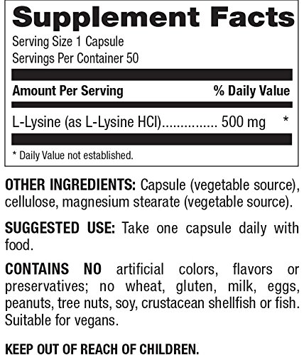 Natural Nutra offers a premium quality gluten free, vegan, and vegetarian L-Lysine supplement. There are no artificial colorings, flavorings, preservatives, wheat, milk, eggs, peanuts, tree nuts, crustacean shellfish or fish.