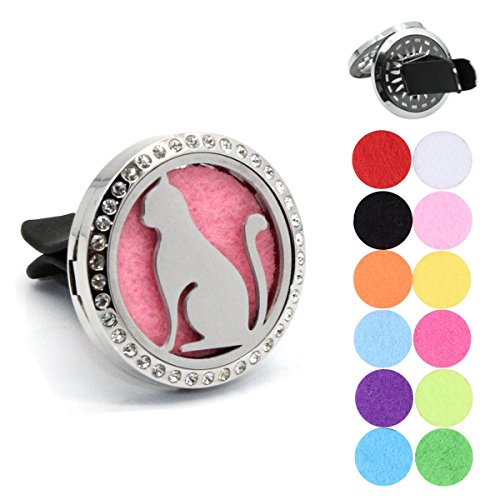 Aromatherapy Essential Oil Diffuser Vent Clip Car Air Freshener/White K Stainless steel/ Hollowed Cat with Rhinestone/ Round/ Open Magnetic Lock...