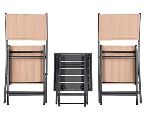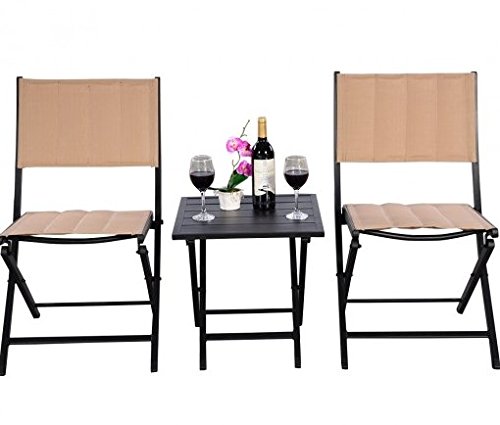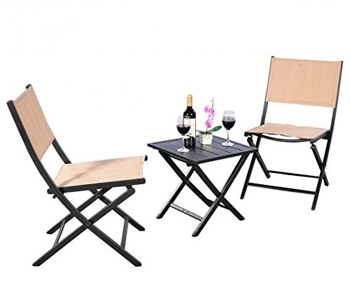 Product Description SKB Family 3 pcs Folding Bistro Outdoor Table Chairs Made of durable steel and fabric 2 foldable chairs Color: Earth yellow Weight capacity of chair: 250 lbs Size of table: 18.1" x 18.1" x 17.9" (L x W x H) Size of chair: 24.6" x 19.3" x 33.8" (L x W x H) Package include: 1 x coffee table 2 x chairs