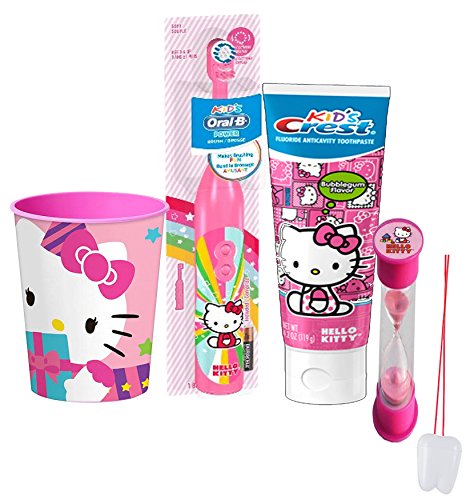 -. Feature : (1) Hello Kitty Turbo Powered Spin Toothbrush (Batteries Included) (1) Crest Kids Hello Kitty Bubble Gum Flavored Toothpast / (1) Hello Kitty 2 Minute Dentist Recommened Brushing Timer To Encourage Proper Brushing! (Assorted Styles) / (1) Hello Kitty 16oz Plastic Mouthwash Rinse Cup (Assorted Styles) / Plus Bonus "Rememer to Brush Your Teeth" bathroom visual aid! This bright foam ornament is a helpful reminder for kids of all ages! Hang it in their bathroom or by their bed so they remember to keep their teeth sparkly fresh.