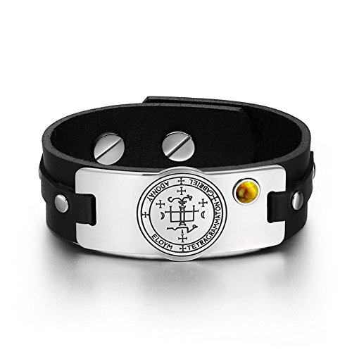 -. Feature : Best Amulets® Collection. Absolutely Fabulous and Unique Amulet Bracelet made from Shiny Polished Stainless Steel and Genuine Leather. Unisex Style which is Perfect for Man and Women. / Bracelet Size: Adjusts from 7 up to 9 inches. Has two Male/Female Buckle Screws which may be Removed and/or adjusted to your Wrist Size if necessary. One Extra Buckle is included just in case you may need it. / Each Amulet Bracelet holds Very Cute and Special Round Cabochon to make it look Unique and Eye Catching. / Ready to Wear. Leather Stripe is about 2.5 to 3mm thick. Stainless Steel Tag and Leather Stripe are about 2.5 inches Wide. / Tag is Engraved with Magic Symbols. Comes with Gift Kind Packaging.