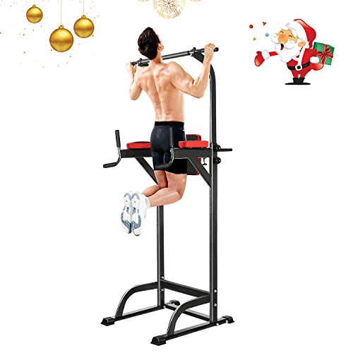 Materials: Steel Pipe and Imitation Leather Adjustable Height: 84.7 inch/77.9inch/71.3inch/64.6inch Dimensions: 29.5 x 25.6 x 84.7 inches (L x W x H) Weight: 46 pounds FEATURES ? Tone and strengthen your back, arms, shoulders and abs muscles for the perfect upper body workout. ? Multiple grip capability will help you strengthen your back, lats, and biceps, through different hand positions. ? Mainly strengthen the abdomen, chest, biceps and other parts of the training, help you have perfect abdominal muscles. ? Sculpt your chest and shoulders with the push-up station. The raised station allows you to perform push-ups with a neutral wrist, decreasing the strain on the wrist joints. Comfortable Hand GRIPS We choose environmental PVC handle, anti-extrusion deformation and more comfortable. High cost only for a better user experience, it will help minimize hand fatigue. Non-slip Rubber End Caps Ziema's Non-slip design protects your floors, and no matter how intense your workout session is, you can be assured that the Ziema Power Tower will remain steady. Bigger and Thicker Forearm Cushions and Backrest Ergonomically designed 3" thick angled backrest provide firm support and protection to your back and waist, 2.25" thick angled forearm cushions for comfortable forearm and elbow support.
