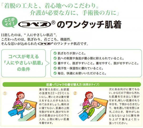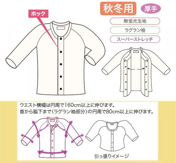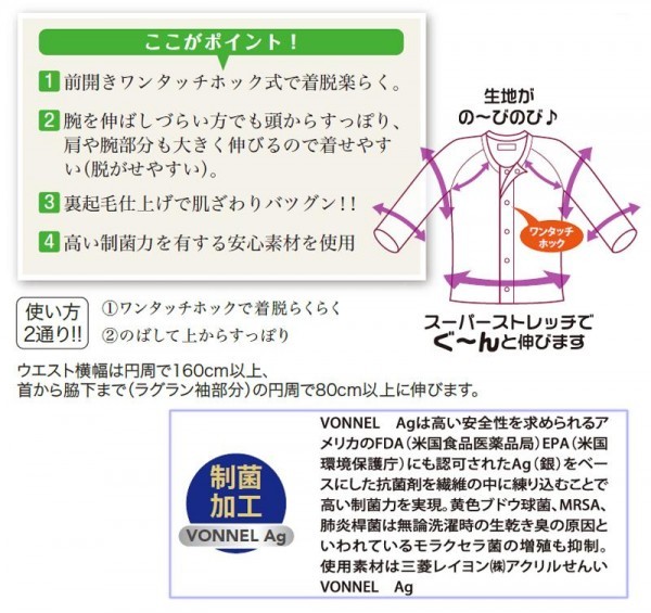 腕を伸ばしづらい方でも頭からすっぽり。肩や腕部分も大きく伸びるので着せやすく脱がせやすい。伸縮性のあるワンタッチ介護肌着。裏起毛仕上げで肌ざわりバツグン!高い制菌力を有する素材を使用しています。 |