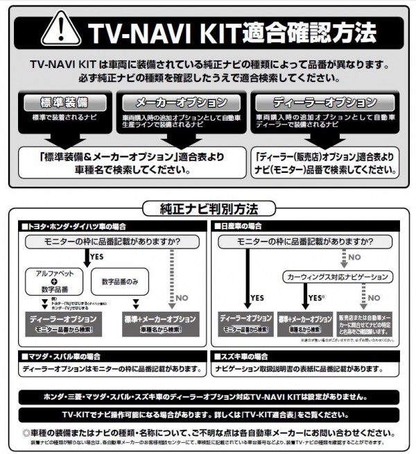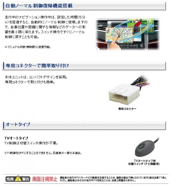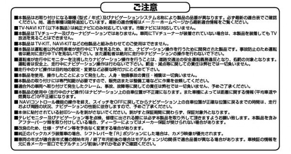 | セット内容 | ・TV&ナビコントロールユニット ・切替スイッチ(ナビ制御用) ・両面テープ ・取扱/取付説明書 ・保証書(ユーザー保証登録カード付属)(1年間) |