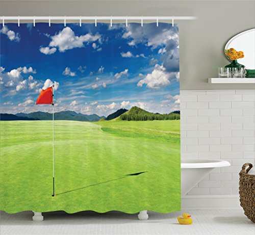 Ambesonne Sports Decor Collection, Golf Field with Flag in the Hole Clouds Sky Summertime Golfing Landscape Picture, Polyester Fabric Bathroom Shower Curtain Set with Hooks, Green Blue Red