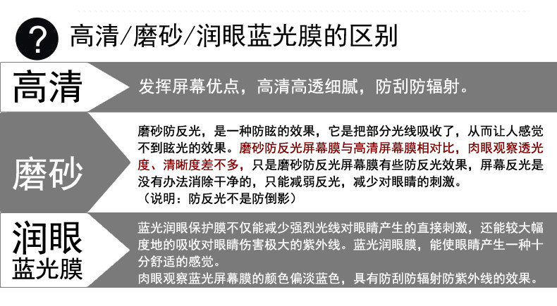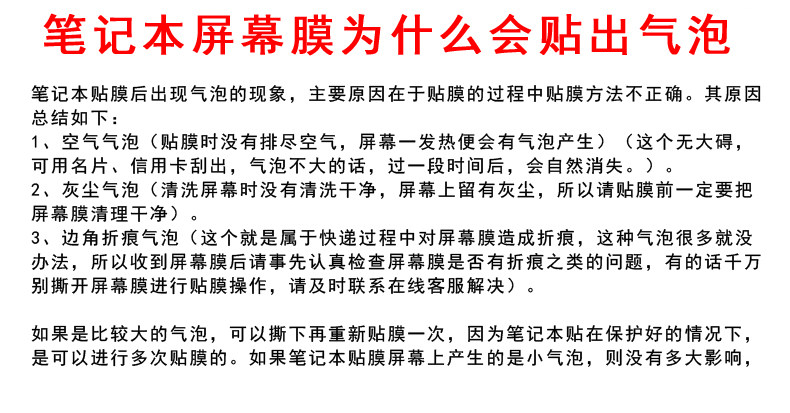 Since the cost of more expensive film screensavers shop, function better, so please parents also do not bargain and customer service, this is a waste of their time with each other, thank you parents for your cooperation! Compare dimensional buyers to make a purchase in order to avoid discrepancies size. Brand notebook size may be slightly error, and can not guarantee that all brands all models without error, please buyers understanding. Caution: In order to make the film does not stick to the bubbles on the screen, the film must take before you clean the screen very, very clean, a little bit of fly ash are not (there is a fly ash has a bubble oh), please buyers to hold their own Oh Note: good quality screen protection film a total of three, and then stick around after both layers should be removed, leaving only the middle layer of the eye like a blue film run: blue color good for eye health, because of the nature of each color kinds of objects on the level of absorption and reflection of light is different. Modern science and technology have proved that blue eyes moistening protective film can not only reduce the direct stimulation produces intense rays of the eyes, but also more substantial absorption of UV damage to the eyes great. Run blue eye mask, make the eyes produce a very comfortable feeling. Scientists have brain waves vary with color vision experiments found that the brain waves of red reaction alert, blue is relaxing. Blue and green are given human nature psychological sedatives. People have such an experience, when the mood irritability, to the park or the beach to see, the mood will soon calm, this is the blue and green of the psychological adjustment results. These shades also help reduce skin temperature, reducing pulse rate, lower blood pressure, reduce the burden on the heart and so on. So, when the day's work you feel physically and mentally tired. Stressful. Mental stress, the appropriate contacts at the two colors will regulate nerve. Sedative, relieve fatigue. Especially natural green of dizziness. Fatigue. nausea and negative emotions have a certain role. Thus, blue eye mask bound to run science and technology to develop the theory of blue eyes moistening screen film effectively protect the eyes vision. Products using PET materials, new generation of high transparent liquid crystal screen protection special materials; protective film surface by the wear scratch, wear high strength; protective film after UV treatment to prevent ultraviolet damage to the eyes and skin, play radiation protection features; light transmission rate of 98%, after pasting the screen is more vivid. Experts advise: the poor quality of the liquid crystal film 1, will be posted to blur on the screen directly affect your vision. 2, and once a long time that you want to remove it when you find a thick layer of glue residue on your host screens to clean him is not an easy thing, and sometimes even accidentally will hurt the screen; 3, abrasion resistance is not high, the use of the liquid crystal film is very short time; 4, poor light transmission of the liquid crystal film will damage the eyes carefully point, I'm sure you can stick good!