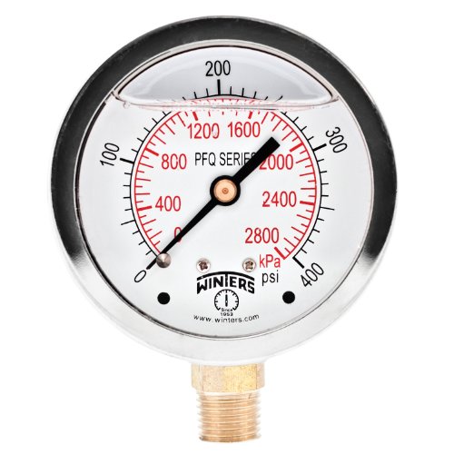 Winters PFQ Series Stainless Steel 304 Dual Scale Liquid Filled Pressure Gauge with Brass Internals, 0-400 psi/kpa,2-1/2" Dial Display, +/-1.5% Accuracy, 1/4" NPT Bottom Mount