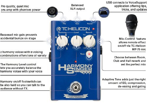 Studio : TC-Helicon Publisher : TC-Helicon Product Description Make your vocals sound killer and add harmonies with the TC-Helicon Harmony Singer pedal. This pedal polishes your vocals to a high-gloss shine with its one-button Adaptive Tone processing that adds EQ, compression, and more to your microphone. The Harmony Singer also adds two harmony voices to your vocals for a full vocal sound. It analyzes your incoming guitar signal and uses your own voice to make pro sounding harmonies. 0