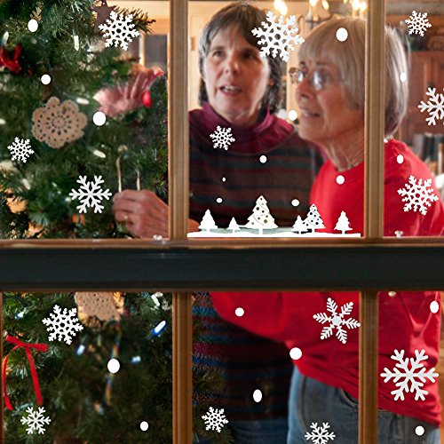 ❄️ QUANTITY & MEASUREMENT: 108PCS snowflake window stickers ( in 3 designs & 3 sizes) + 64 white dots + 4 Christmas tree set. 4 sheets included. each is 14"x 10". They are all in white, snow flakes Largest Size :4.45" x 4.45" .Medium Size :3.19" x 3.19". Smallest Size: 2.36"x 2.36",each Snowflakes is independent