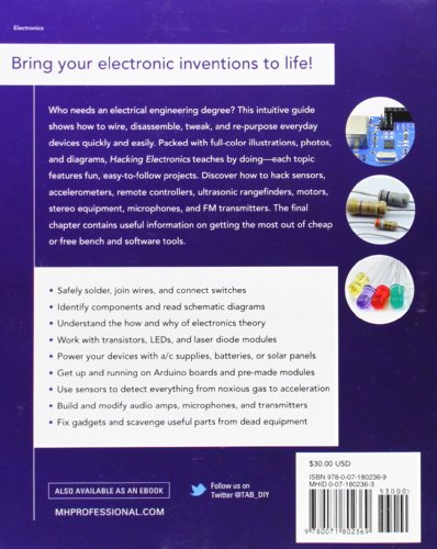 Who needs an electrical engineering degree? This intuitive guide shows how to wire, disassemble, tweak, and re-purpose everyday devices quickly and easily. Packed with full-color illustrations, photos, and diagrams, Hacking Electronics teaches by doing--each topic features fun, easy-to-follow projects. Discover how to hack sensors, accelerometers, remote controllers, ultrasonic rangefinders, motors, stereo equipment, microphones, and FM transmitters. The final chapter contains useful information on getting the most out of cheap or free bench and software tools.