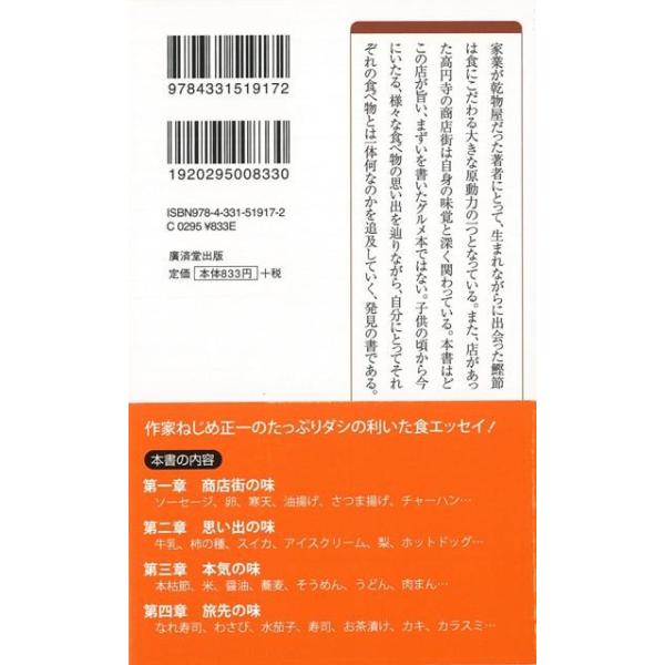 【商品説明】 定価(税込み):900円 値引き:5% OFF 『高円寺純情商店街』で直木賞を受賞したねじめ正一氏は、そもそも高円寺商店街の乾物屋の息子であり、 食に対する高い意識を持っている。本書は、ねじめ氏のこだわりの食を「商店街の味」「なつかしの味」「本気の味」「旅先の味」の四章立てで、紹介する。 バーゲンブック 新品 特価 格安 地図 ガイド グルメ |
