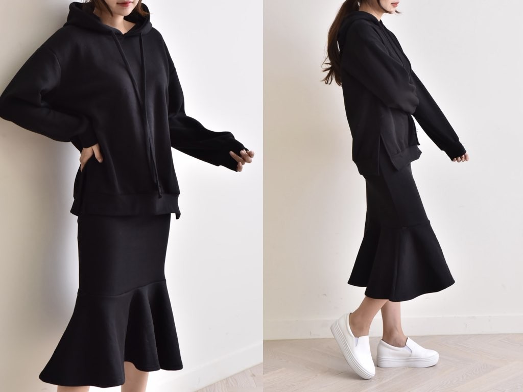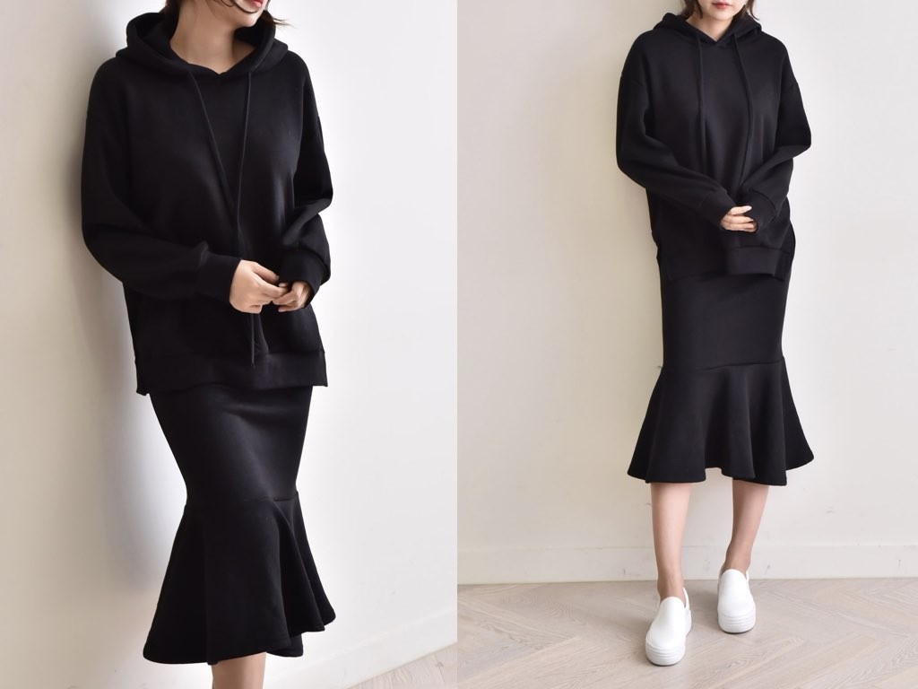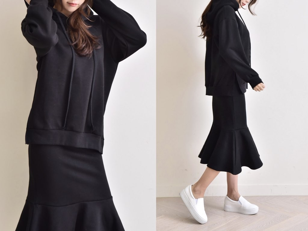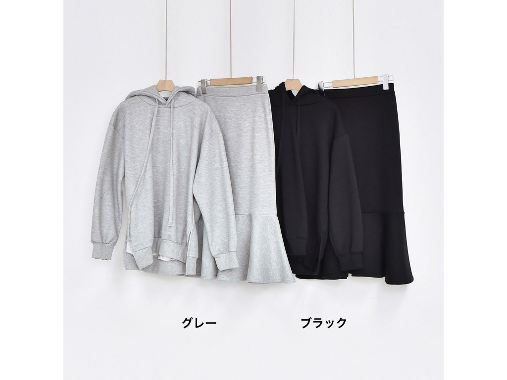 「ふわっふわ」としたパーカーとスカートの上下セットです。とても丁寧なつくりとなっており、ゆったりと着ることができます。1.基本情報色:ブラック・グレーサイズ:Free素材:綿製造国:Korea2.サイズ情報(1)フード肩幅:54cm 身幅(胸断面):54cm アームホール:53cm 着丈:66cm(2)スカートウエスト(断面):32cmヒップ(断面):38cm 総丈:78cm (サイズは計る方法に応じて±2〜3cmの誤差があります。ご了承お願い致します)モデル着用サイズ:F※着用モデル(163cm、体重47kg、足のサイズ245mm)3.その他の情報厚み:中間透け感:なし伸縮性:中間裏地:有り(起毛)洗濯方法:洗濯お取り寄せ商品は、納品まで約10日前後いただきます。ご了承お願い致します。