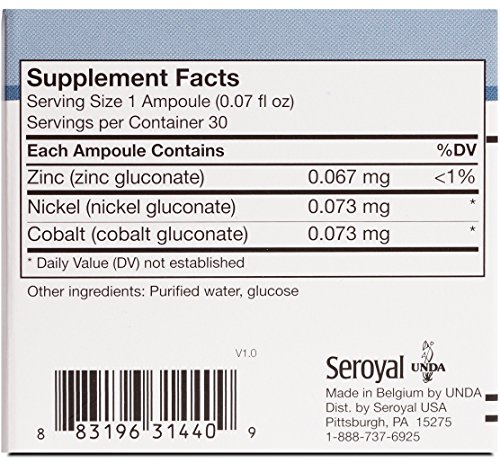 -. Binding : Health and Beauty -. Brand : Unda -. EAN : 0883196312900 -. Feature : Furnishing the body with ions indispensable for cellular enzymatic functions and maintaining optimal health. / 30 unidoses -. IsAdultProduct : 0 -. Label : Seroyal -. LegalDisclaimer : * These statements have not been evaluated by the Food & Drug Administration. These products are not intended to diagnose, treat, cure or prevent any disease. Please contact your healthcare professional immediately if you experience any unwanted side effects. The information contained herein is for informational purposes only and does not establish a doctor-patient relationship. Please be sure to consult your physician before taking this or any other product. -. Manufacturer : Seroyal -. MPN : 17152 -. PackageQuantity : 1 -. PartNumber : 17152 -. ProductGroup : Health and Beauty -. ProductTypeName : HEALTH_PERSONAL_CARE -. Publisher : Seroyal -. Studio : Seroyal -. Title : UNDA - GAMMADYN Zn-Ni-Co - Zinc-Nickel-Cobalt Oligo-Element Supplement - 30 Ampoules -. UPC : 883196312900