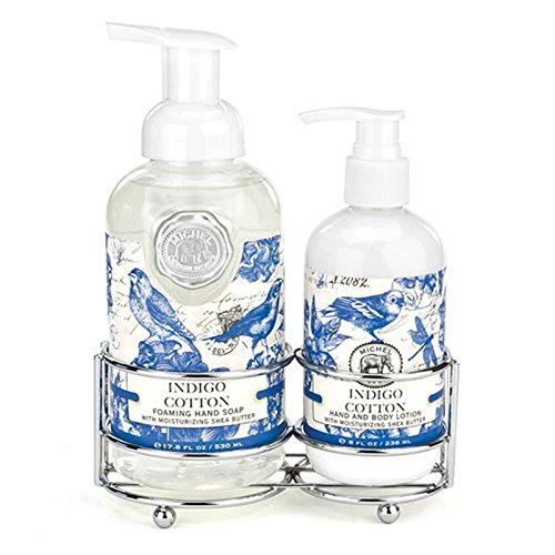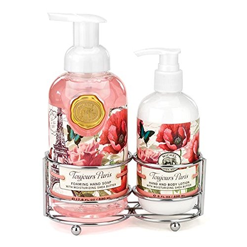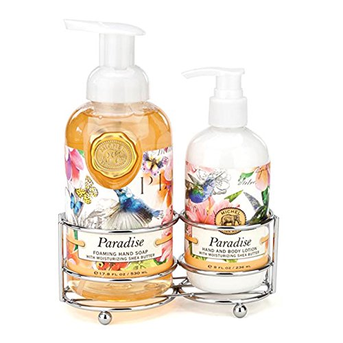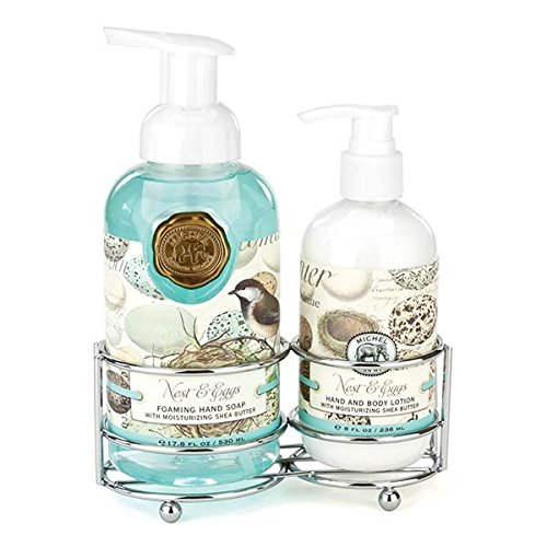 Everything wonderful is best served up in twos. Rich hand lotion and cleansing foaming hand soap are paired together in a simple and convenient silver caddy sure to fit in any bath or kitchen. Michel Design Works was created by Bruce & Deborah Michel in the early 1980s. The first product was an elaborate "memory book" called Our Country Diary. Still a favorite today, it is filled with vintage artwork, quirky quotes, notable dates and plenty of room to record all the events of the year. Our Country Diary will become a beautiful record of your family life. When they first created their signature elephant logo, it signified a remembrance of all things special. Although Michel Design Works has greatly expanded into bath & body, home fragrance and decor, when Bruce & Deborah remember and celebrate all of their wonderful customers and the company's history, it is even more fitting today! Whether you are a new or a long-time friend, we welcome you to enjoy the art, lather up with our English soaps, set an elegant table with napkins, candles, plates, and serveware, and end your day with wonderfully fragrant bubble bath.Feature