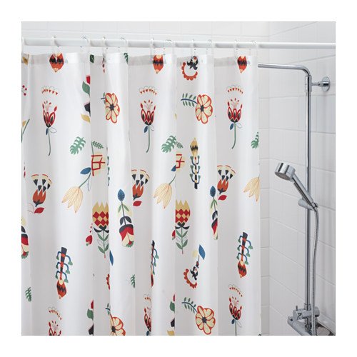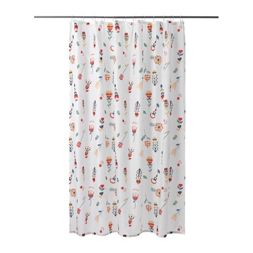 Densely-woven polyester fabric with water-repellent coating. The elastic sewn into the bottom edge adds weight to the curtain and assures that it hangs straight. To be completed with shower curtain rings and a shower curtain rod.