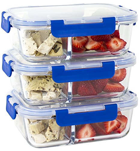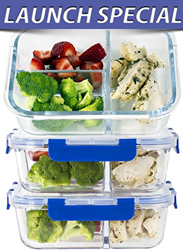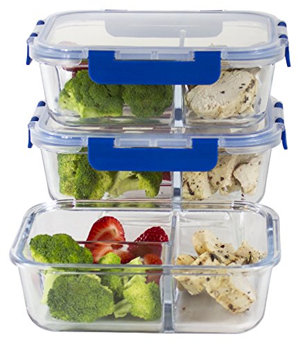 - PERFECT SIZE & BEST VALUE – 6 Piece Set 3 Three Compartment glass food storage containers and 3 snap locking lids, we guarantee we have the best quality products at the best price. 3- 36 Oz (4.5 Cups), 8” x 6.5” x 3” main compartment 2 Cups and small compartments 1.25 cups each, easy for meal prepping, saves space, and travels easily