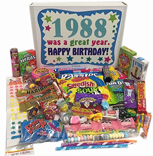 -. Binding : Misc. -. Brand : Woodstock Candy -. Feature : Makes a fun and unique gift for someone born in 1988 / Perfect for the person who has everything / Everyone loves candy from their childhood! / Box reads "1988 was a great year. Happy Birthday!" / Comes shrink wrapped in a box that measures 11.75" x 9" x 2" -. IsAdultProduct : 0 -. Label : Woodstock Candy -. Manufacturer : Woodstock Candy -. PackageQuantity : 1 -. ProductGroup : Grocery -. ProductTypeName : GROCERY -. Publisher : Woodstock Candy -. Studio : Woodstock Candy -. Title : 1988 29th Birthday Gift Box of Retro Nostalgic Candy from Childhood for a 29 Year Old Man or Woman