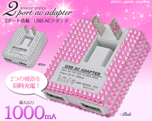 | 製品仕様 | | サイズ | (約)H55×W50×D15mm | | 重量 | (約)45g | | 入力 | AC100-240V 15VA 50-60Hz | | 出力 | DC5V 1000mA(2ポート合計) | | 色 | ホワイト/ピンク | | 注意 | ※すべてのUSB機器で動作保証するものではありません。 ご了承ください。 ※充電機器の組み合わせにより(1000mA以上など)複数同時に充電できない場合がございます。※ケーブル・スマホ・iPhoneは付属しません。 ※画像はイメージです。 ※ラインストーンが貼られていない余白部分が若干ございます。 ※衝撃を与えると、ラインストーンが取れる場合があります。 | |