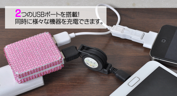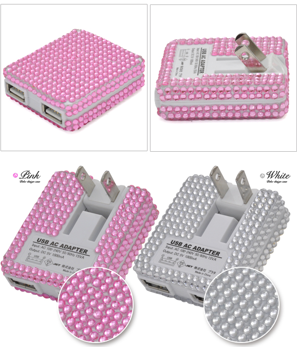| キラキララインストーンを贅沢に使用し、キュートで豪華なUSB-ACアダプタに仕上げました! ピンクとホワイトの2色展開です。 コンセント部分は折りたたみ式なので、コンパクトに収納できます。 また、コンセントの角度を調節することができます。 | |
