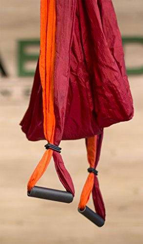 Achieve deeper backbends and instant back pain relief with the yoga trapeze. The yoga trapeze is the most powerful, at home yoga inversion tool ever created. Hang it of your door frame or from an exposed beam, bar or swing set. Setup is fast and simple, results are immediate. Heal your spine at home. Our students report that the yoga trapeze is more effective than a 1-hour deep tissue massage or a multiple series of chiropractic adjustments. The yoga trapeze strengthens and loosens the muscles surrounding the spine naturally - so you can eliminate the source of the pain both short and long term. Most back pain specialists recommend a 3-pronged approach for long term back pain relief. Traction: the yoga trapeze creates natural, body weight traction - the safest and most effective kind. Back and core strengthening: for dynamic, deep core strength, nothing compares to inverted, gravity resistance training. Flexibility: just hang back, grab your ankles and chill out. This is the safest, deepest backbend you could ever do unassisted (and painless). You will make flexibility gains effortlessly.Feature