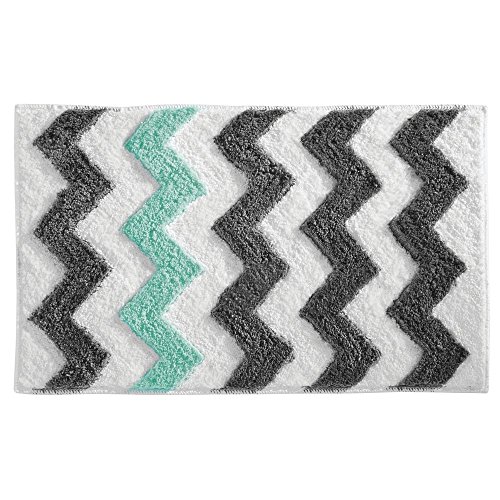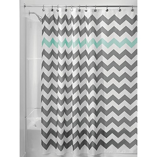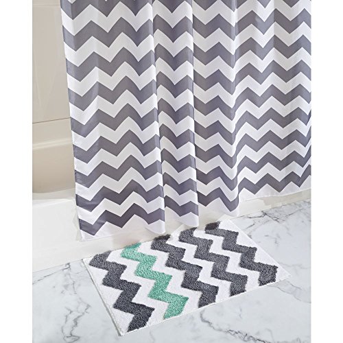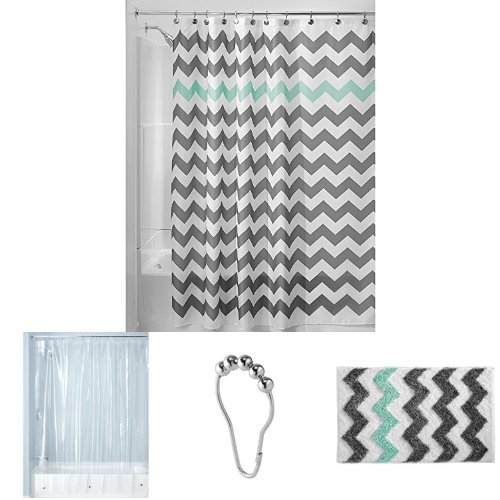4-PIECE SET INCLUDES: A Chevron fabric shower curtain and matching microfiber polyester rug, a mold/mildew-resistant clear liner and 12 stainless steel shower curtain rings