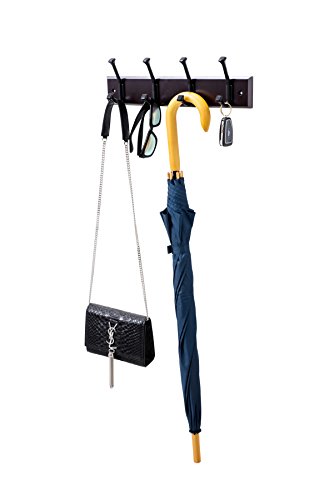 Finnhomy 4 Dual Wall Hooks Of high durability and dependability. A simple wood base completes the contemporary design, adding a touch of sophistication to your home. Made of sturdy steel and wood, suiting for hanging towel or clothes in entryway, bedroom, kitchen, garage, storage room, etc. Type: Wooden Coat Hooks Style: Contemporary Color: Espresso/Black hook Material: Wood and Stainless Steel Mounting Type: Wall Mounted Size : 4Dual Hooks ; (L*W)about :16 1/8"L x 2 3/4"W (41 x 7 cm) Package contains: 1 * hook rack 1 * bags of Screws and Caps 0