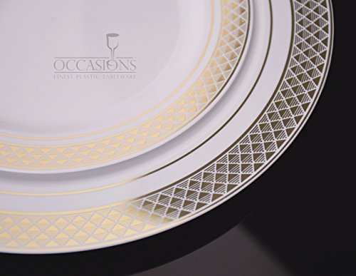" OCCASIONS " 120 PACK, Heavyweight Disposable Wedding Party Plastic Plates (10.5'' Dinner Plate, Celebration White / Gold)