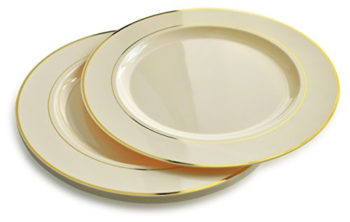 " OCCASIONS " 120 PACK, Heavyweight Disposable Wedding Party Plastic Plates (9'' Luncheon Plate, Ivory / Gold Rim)