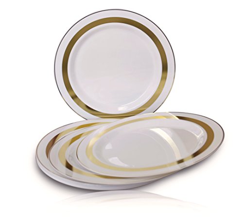 "OCCASIONS" 120 PACK, Heavyweight Disposable Wedding Party Plastic Plates (10.5'' Dinner Plate, White / Gold Rim)