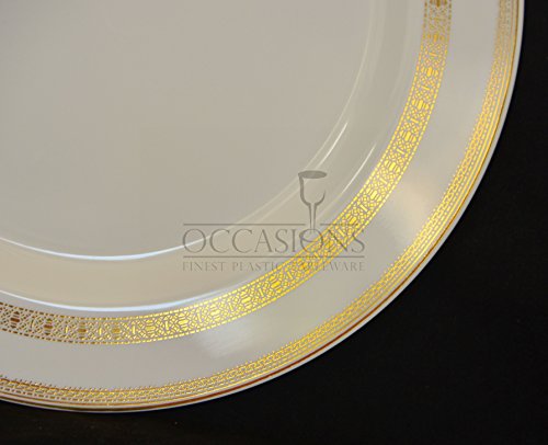"OCCASIONS" 120 PACK, Extra Heavyweight Disposable Wedding Party Plastic Plates / Chargers / Serving Tray (12'' Plate, Ivory with Gold Rim)